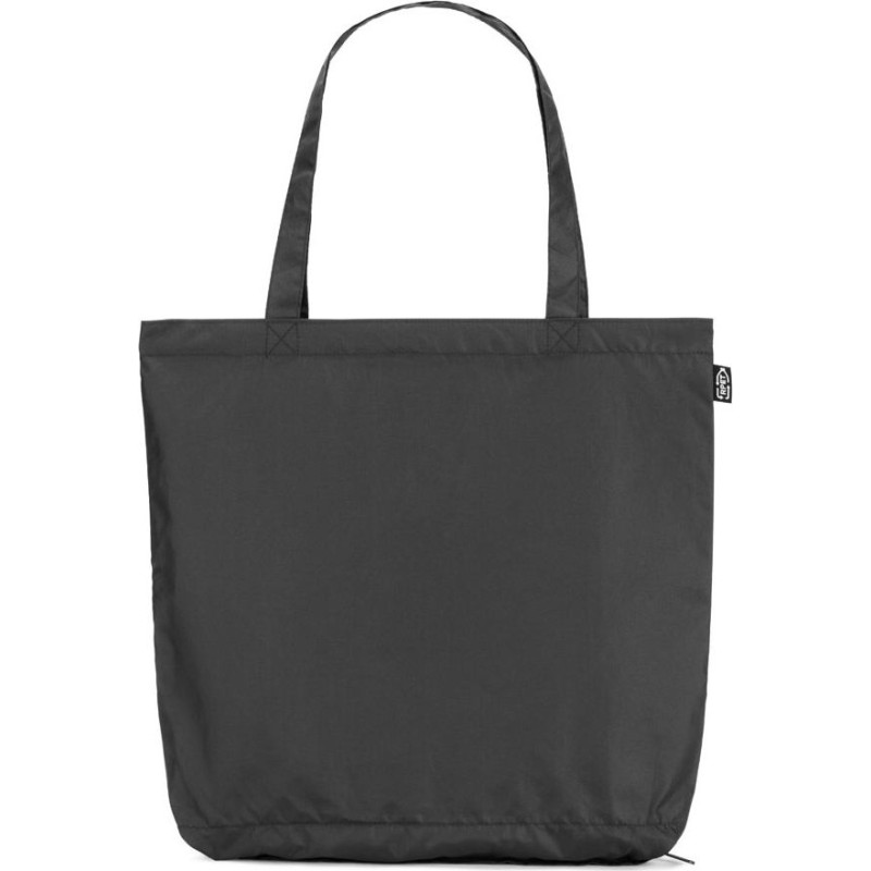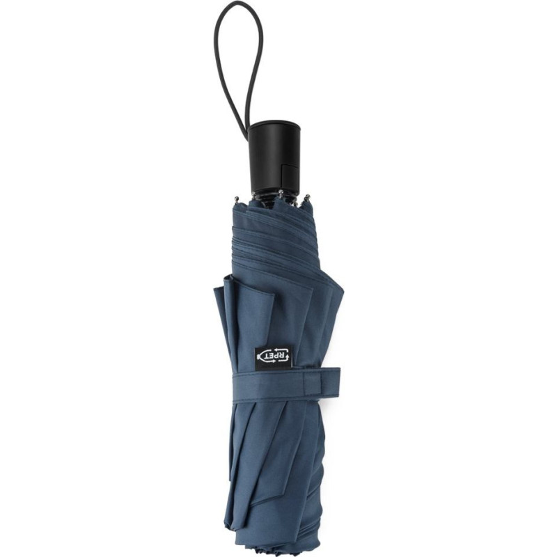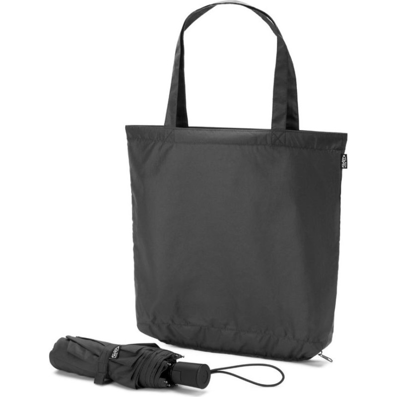 2-in-1 umbrella with recycled polyester shopping bag included. The 21'' folding umbrella in recycled polyester (100% rPET) pongee 190T, fibreglass rods, metal pole and handle in recycled ABS (35% recycled). Folding umbrella in 3 sections, with automatic opening and windproof. Shopping bag in recycled polyester, which can be stored for transport or used separately. Ø 970 x 290 mm |Bag: 420 x 390 mm
