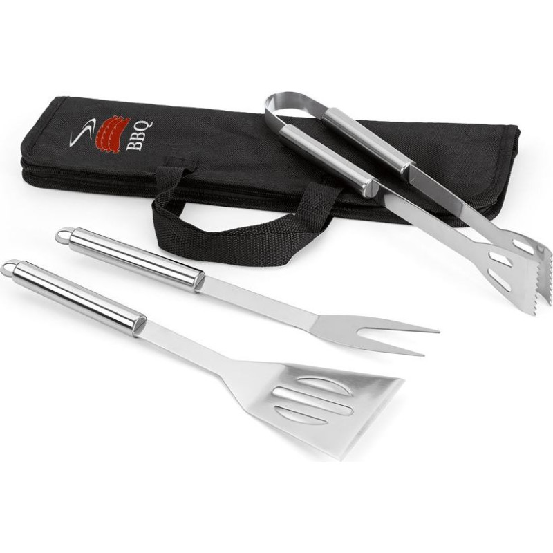 Barbecue set with 3 stainless steel pieces: tong, fork and spatula. Supplied in a non-woven bag with handles. Bag: 405 x 120 x 25 mm