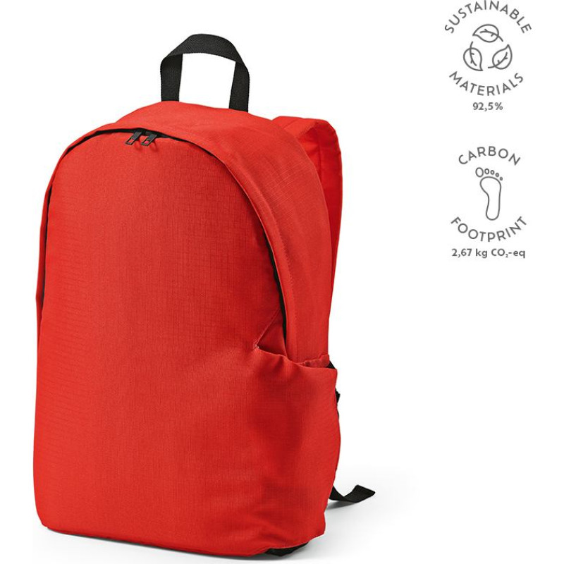 Tallin backpack in ripstop-finished 600D rPET. This 23L backpack includes a dedicated compartment for a 17'' laptop and a spacious central compartment with multiple pockets for organisation. The sturdy top handle offers convenient carrying options and your drinks bottle can sit neatly in the bottle holder on the side. Padded and adjustable straps for added comfort. Supplied in a recycled PE polybag.