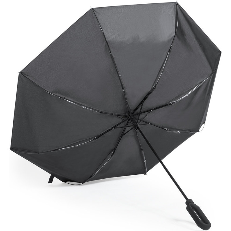 8-panel folding umbrella in a wide range of tones. 100cm in diameter, manual opening, with windproof system and in resistant pongee material. With black fiber ribs, velcro closure and ergonomic handle with built-in carabiner closure. Presented in a matching color individual case.