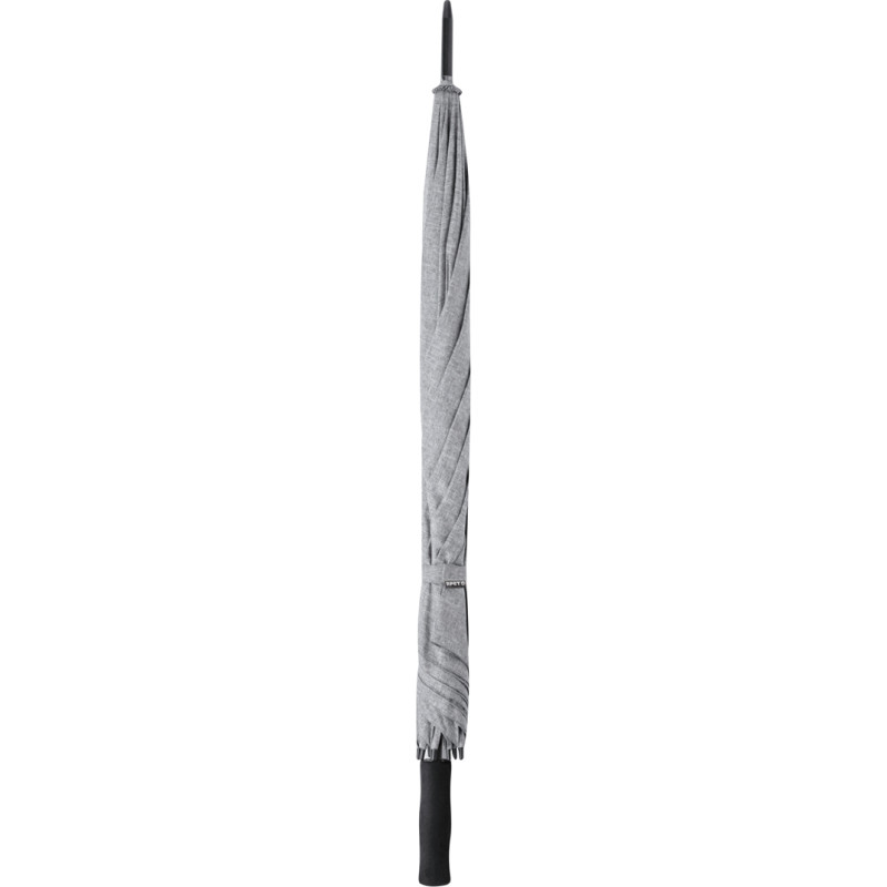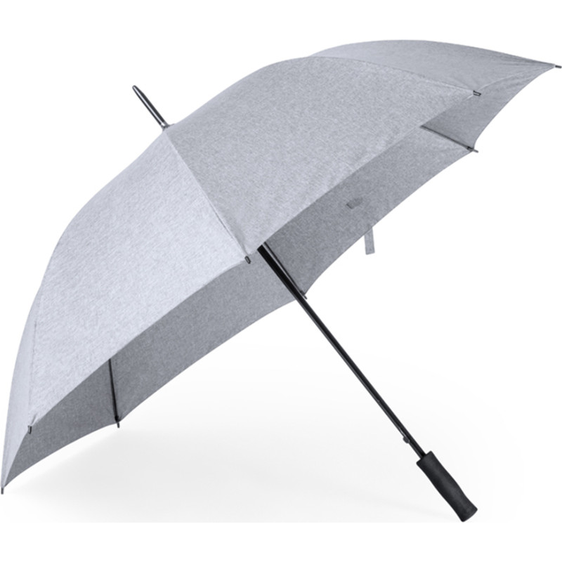 High quality 130cm diameter umbrella. Made of durable 150D polyester material and in an elegant marbled grey tone. Automatic opening and fibreglass ribs, with windproof system and velcro closure. With ergonomic handle in soft EVA and presented in a recycled bag.