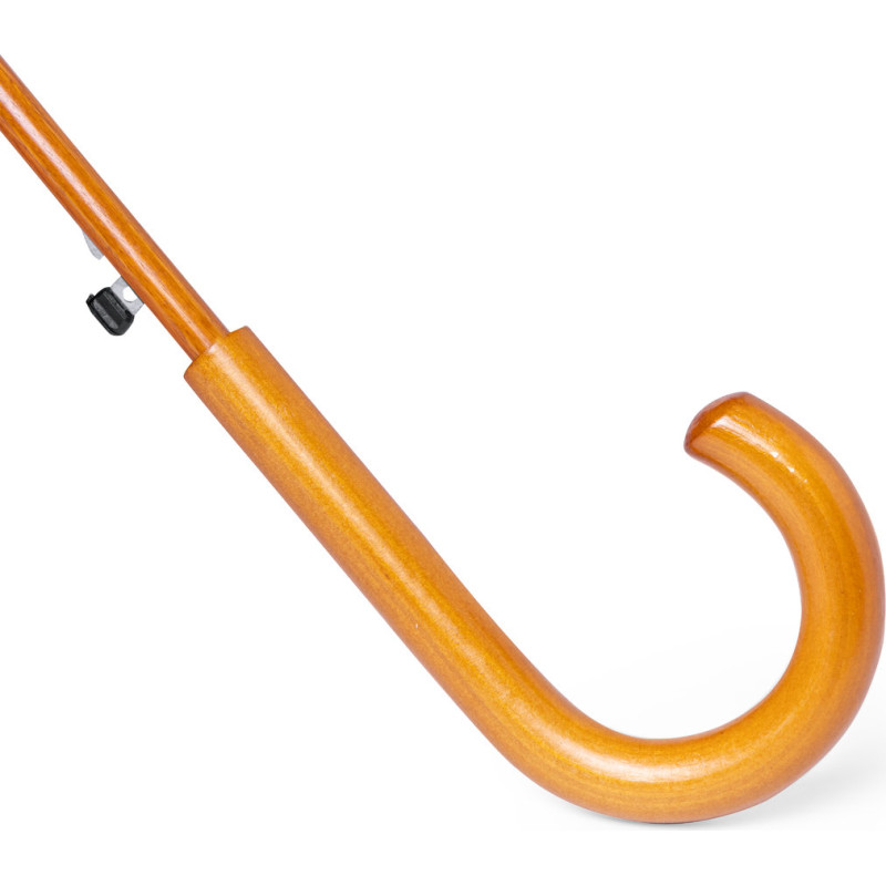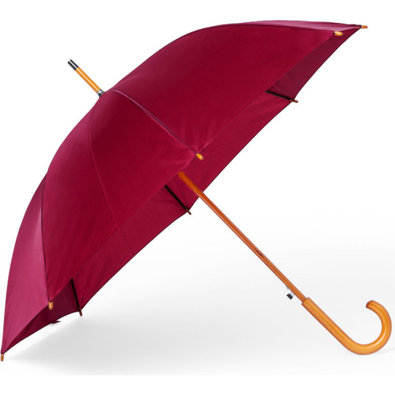 8 panel umbrella with 105 cm diameter, made of durable 190T polyester material. Automatic opening, with curved handle and shaft, both in wood. Black metal ribs, velcro closure strap and available in a wide range of colors.