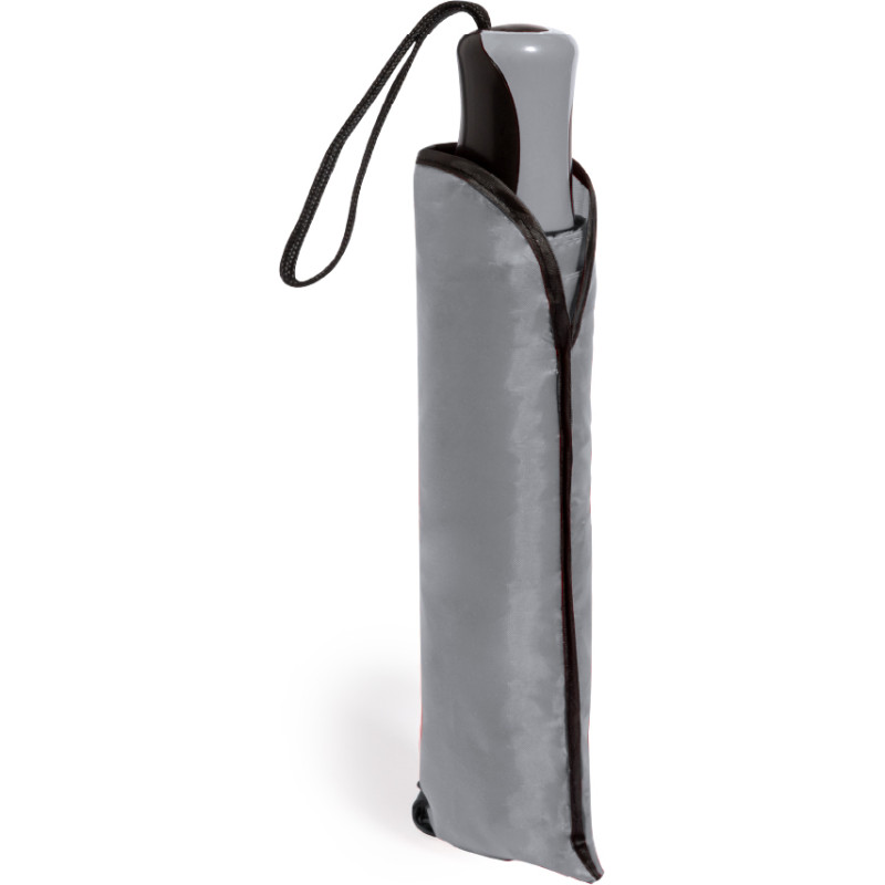 8-panel folding umbrella made in 190T polyester. Manual opening, with silver coloured metal ribs and velcro fastening. Ergonomic handle with carrying strap and matching protective sleeve. Available in a wide range of colours. Presented in an individual recycled bag.