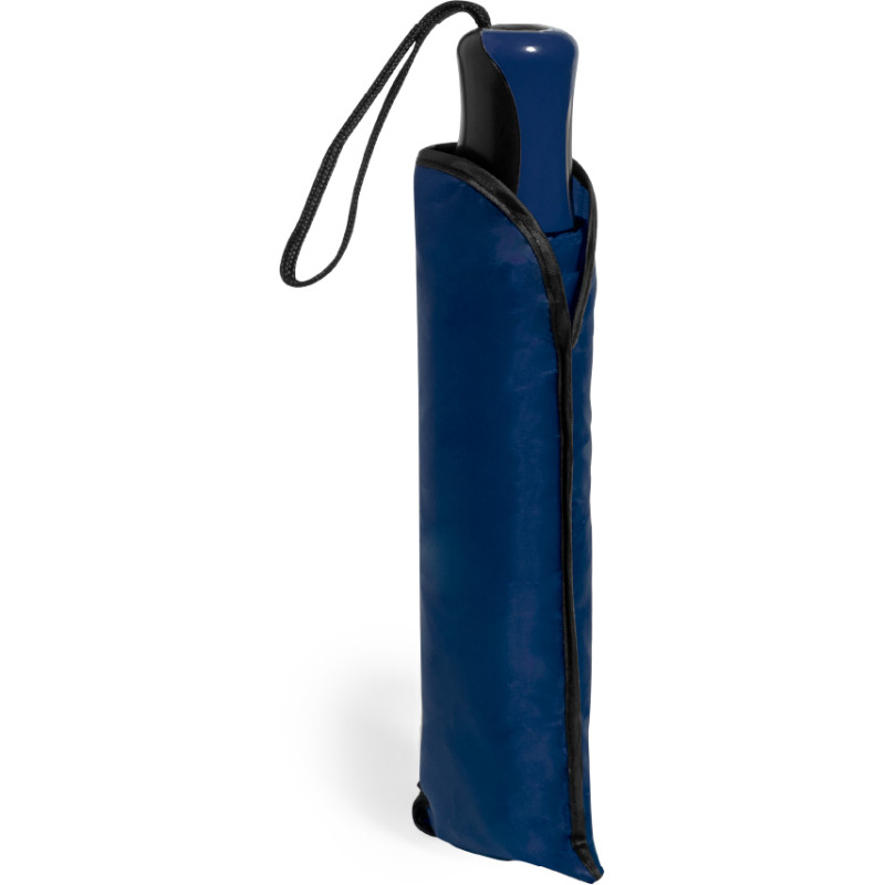 8-panel folding umbrella made in 190T polyester. Manual opening, with silver coloured metal ribs and velcro fastening. Ergonomic handle with carrying strap and matching protective sleeve. Available in a wide range of colours. Presented in an individual recycled bag.
