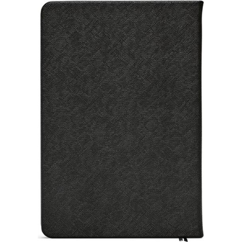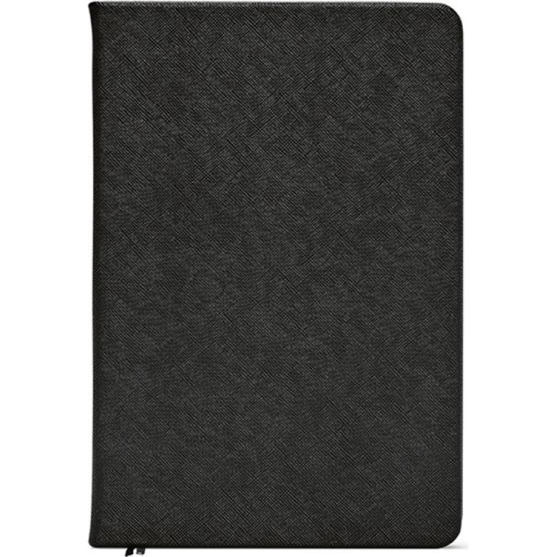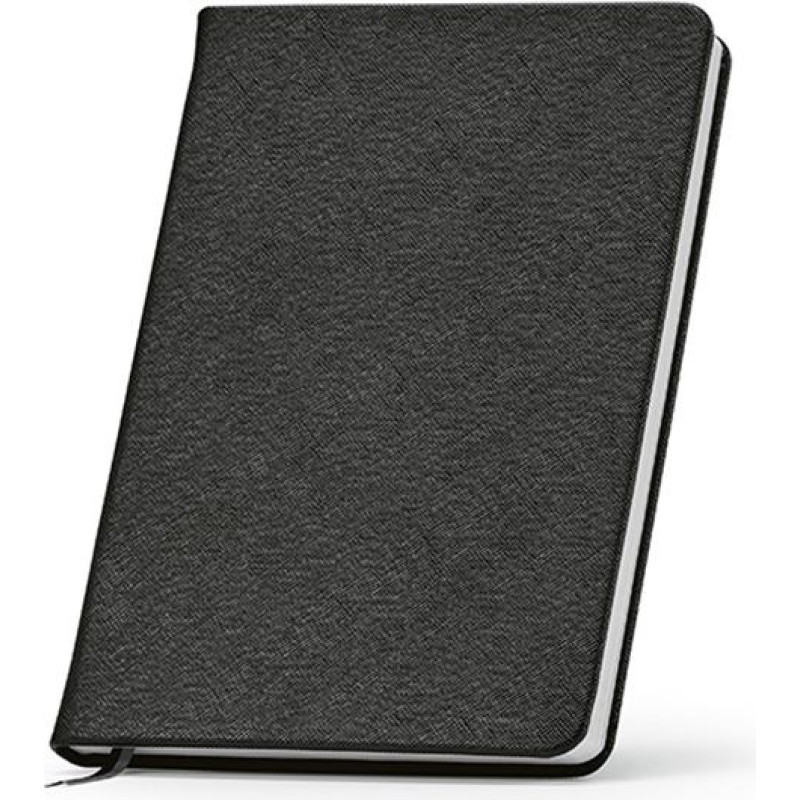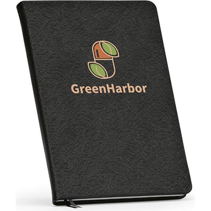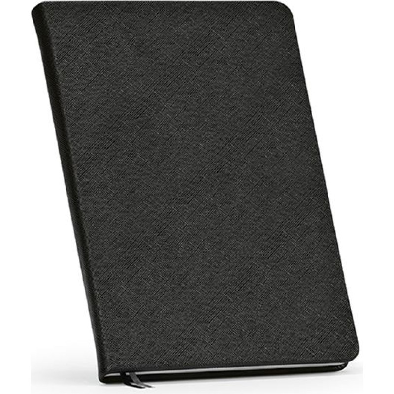 Wilde hardcover recycled PU notebook. Inside, discover two convenient pockets, ideal for organizing loose items. Two ribbon markers help you navigate the 196 80gsm FSC ivory dotted pages, with an area reserved for date and page number making it a thoughtful blend of eco-consciousness and practicality. Comes with a metal plate that can be customized and placed on the front cover of the notepad. Supplied in an individual kraft sleeve.