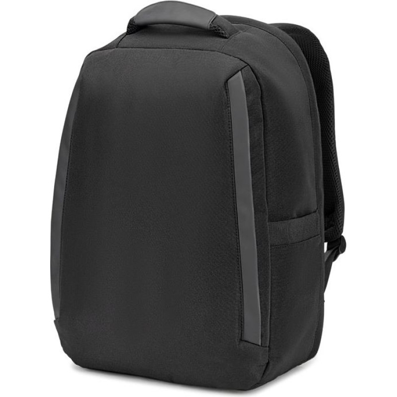 Anti-theft backpack with a unique design designed to ensure greater security for your devices and documents. Made of 600D recycled twill polyester, water-resistant, with PU details and a 210D recycled polyester lining. It has a main compartment with a padded pocket for a laptop up to 17'3" and a tablet up to 10'5", side pockets and a front pocket. The backpack offers you greater comfort when travelling due to its padded top handle and back with extra padding and trolley strap with pocket for small items. The internal pockets make it easy to store and organise your gear. Capacity up to 20 L. 310 x 450 x 200 mm