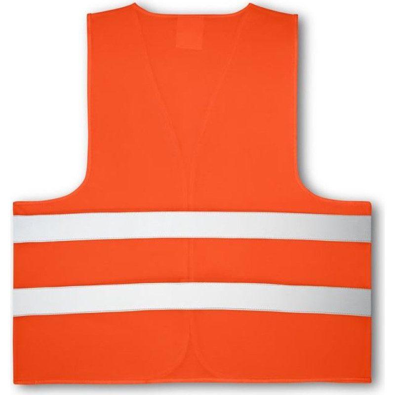 100% polyester high visibility vest certified with EN ISO 20471 class 2. Reflective vest with 2 horizontal reflective bands and a self-adhesive hook and loop fastener front opening. One size: 670 x 700 mm