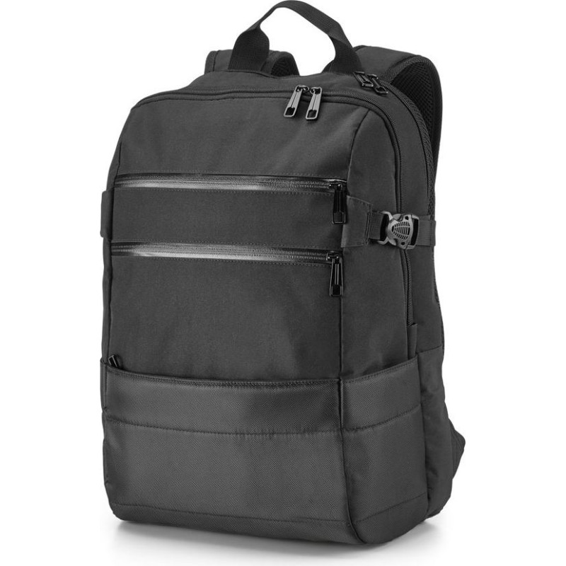 840D jacquard and 300D laptop backpack with 2 compartments. The back compartment is lined and padded, with 2 padded computer compartments up to 15'6'' and 10'5'' tablet. The front compartment is lined and has several interior pockets. It has 3 front pockets and 2 side pockets. The back is padded, has padded back support and padded straps. Capacity up to 25 L. 320 x 450 x 190 mm
