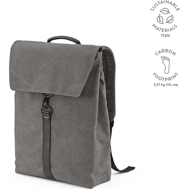 Prague Backpack with a sleek and functional design. This 25L backpack carefully merges recycled cotton canvas with recycled PU details. Fits a 17'' laptop, secured by a metal lock. Back padding and padded straps, top sealed with clic-clac button. Comes in a recycled cotton bag.