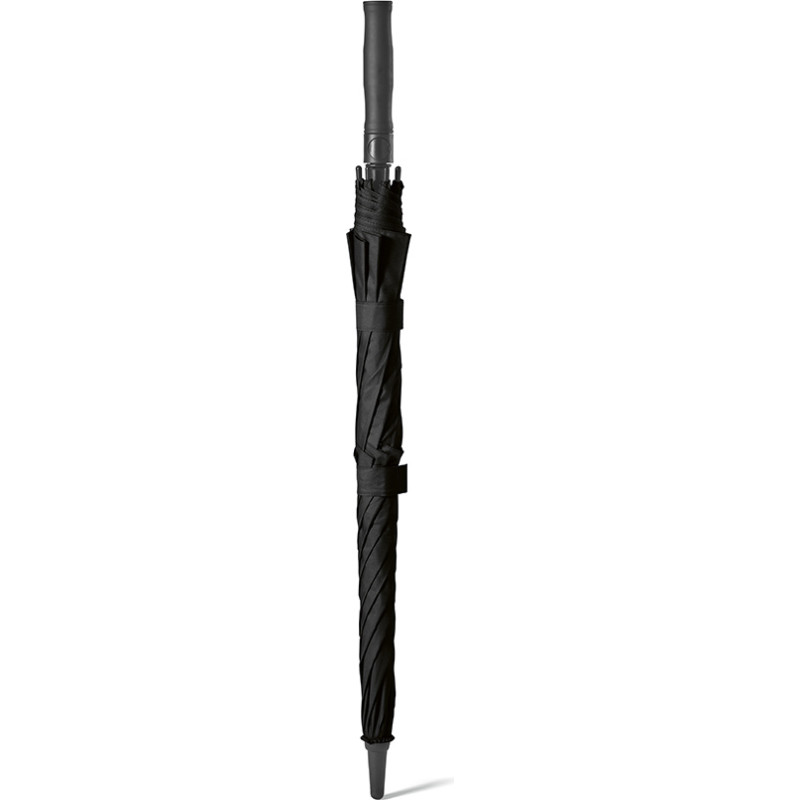 Prince 23'' rPET umbrella. Storm-proof and fibreglass structure, rABS vertical handle and 8 panels. Opens automatically for quick shelter. The velcro strap closes the double canopy frame. Eco-friendly packaging in a rPET individual pouch. Stay dry with style adding your logo to the dedicated area on the the handle.