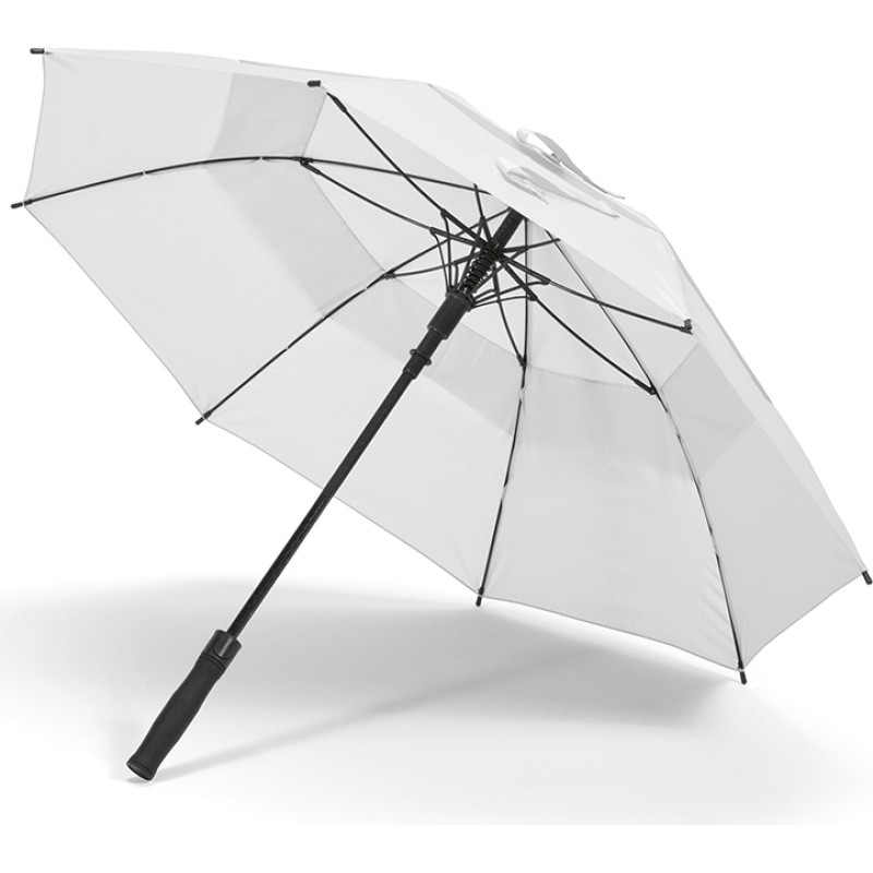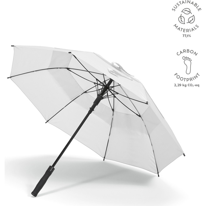 Prince 23'' rPET umbrella. Storm-proof and fibreglass structure, rABS vertical handle and 8 panels. Opens automatically for quick shelter. The velcro strap closes the double canopy frame. Eco-friendly packaging in a rPET individual pouch. Stay dry with style adding your logo to the dedicated area on the the handle.